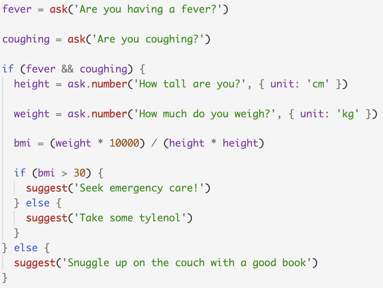 In this project we built such a triaging engine using a DSL. It supports any number of ways to query a patient. It's also fully asynchronous so a patient can pause midway through and finish at a later time. The idea is to build small reusable well-tested modules that dive deep into a specific topic like alcohol habits, diabetes or heart disease. You can then use these modules to compose a general-purpose triaging flow.